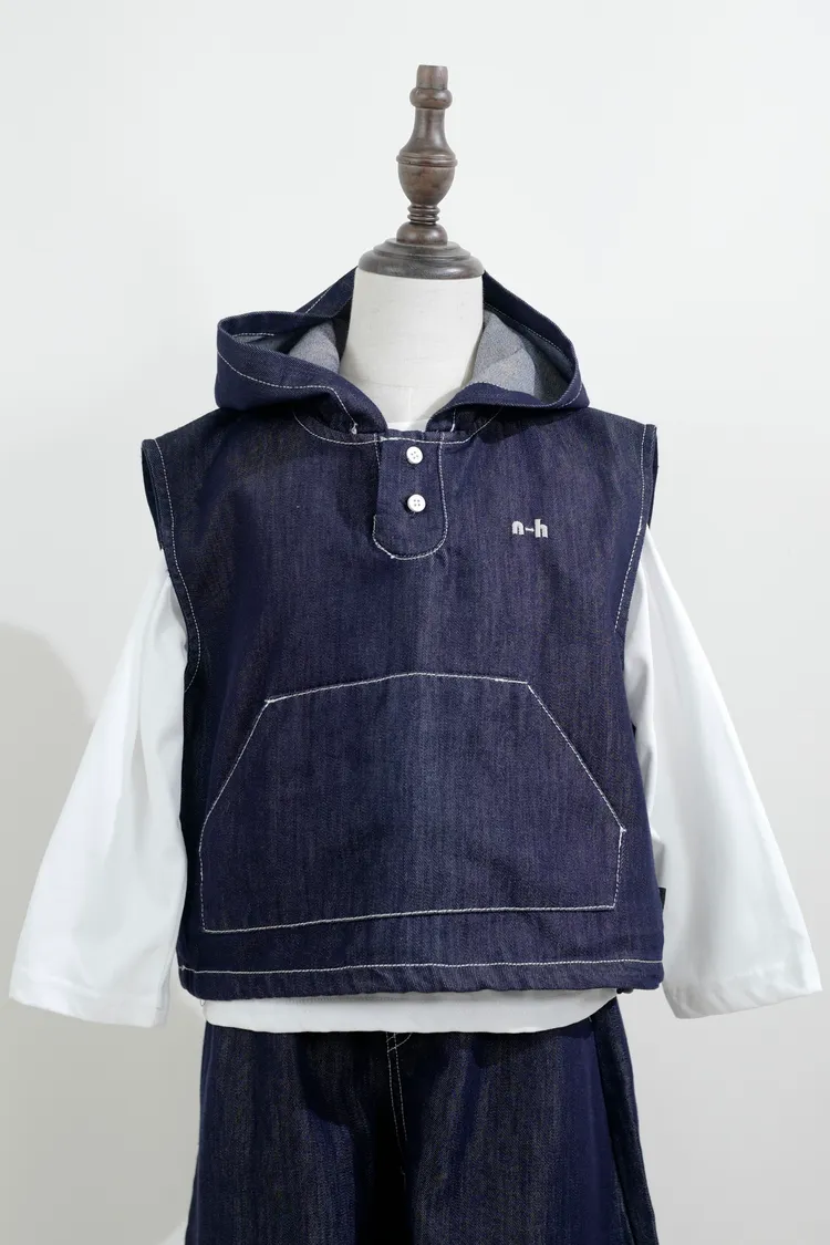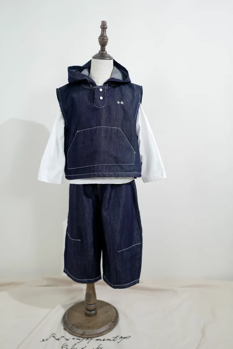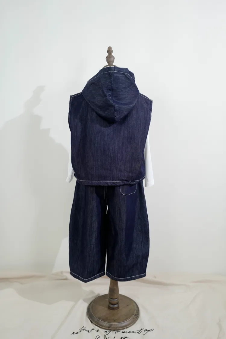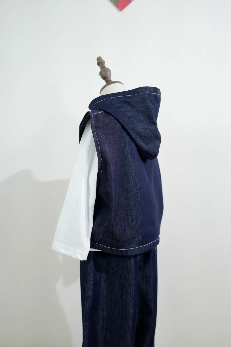 牛仔連帽三件套套裝(背心+內搭+長褲)